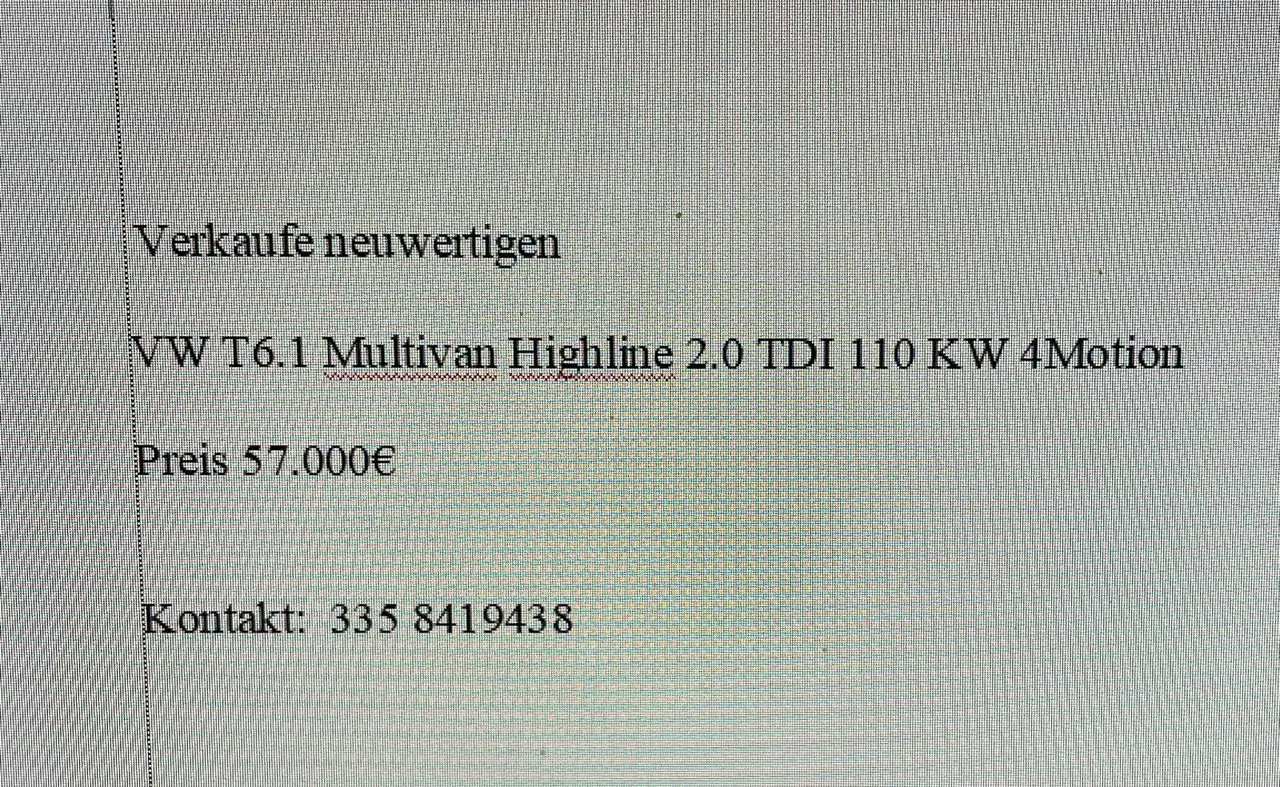{"sthp":"150","leasing":"false","seg":"minivans,widevans,suv,utilities","stmak":"Volkswagen","did":"50786149","stmil":"41549","gear":"S","stmod":"T6.1 Multivan","cost":"57000","stmon":"12","styea":"2020","make":"74","ad":"private","vat":"0","art":"12","carby":"0","fr":"9","stccm":"1968","buyonline":"false","stkw":"110","zip":"IT39021","model":"75741","equi":"115,10,142,42,125,189,46,121,221,38,224,156,225,41,134,2,32,34,148,161,17,12,54,159,113,219,140,155,3,18,150,143,43,218,23,214,146,19,239,242,126,47,15,215,222,232","mia":"false","miles":"3","img":"https://prod.pictures.autoscout24.net/listing-images/05d73454-fd2b-49d5-a5c0-b1f7fe627714_07f891b7-70df-4757-9554-8c95df9cb53b.jpg/720x540.webp","price":"8","rnd":"39","ECO":"YES","fuel":"D","kenteken":"false","acc":"U","hp":"7","type":"U","atsd":"","zip2":"39021","articleType":"C","city":"Laces","cockpit":"F"}